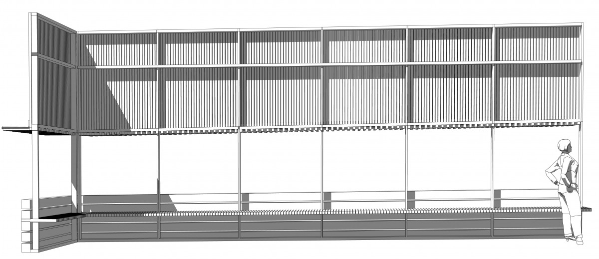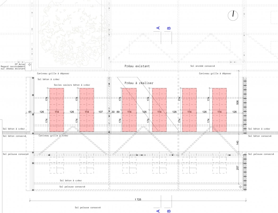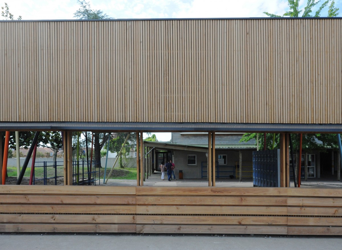 Le projet crée une extension du préau pour abriter les casiers de rangement des cartables. La couverture laisse émerger les trois arbres existants. La base de l’écran est composée d’une superposition de poutres qui suivent la pente régulière de la cour. Les lames de bois, qui espacent ces poutres, sont prolongées pour former un banc continu coté couvert. La partie haute de l’écran est couverte de lames, étroites et ajourées, en pin traité par autoclave. La rive haute de l’écran se raccorde sur la rive horizontale de la couverture. L’ouverture continue entre les deux parties de l’écran trace deux lignes inclinées, parallèles à la pente du sol. Un auvent métallique protège l’ouverture de la pluie.