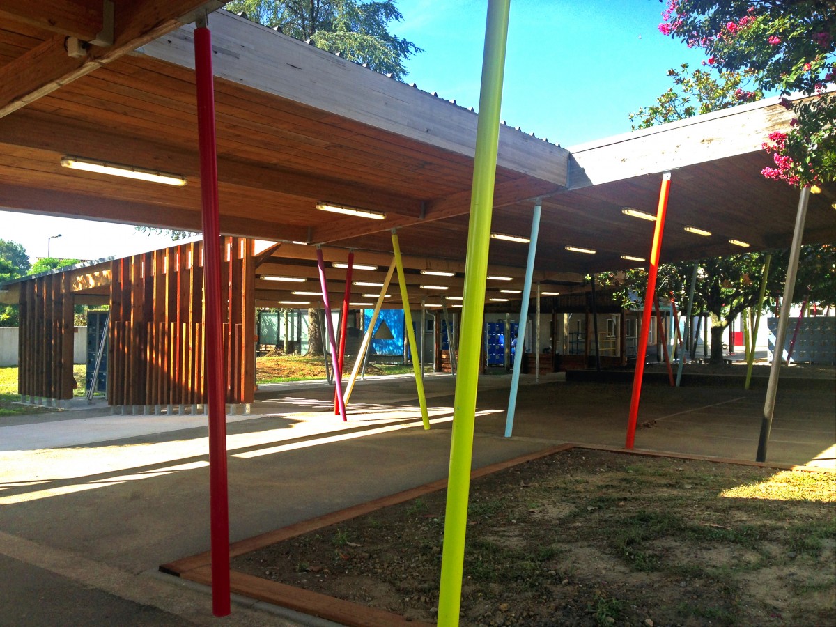Descriptif technique Sur un sol béton, des poteaux métalliques viennent s’ériger pour soutenir un système de charpente lamellé collé en sapin. Le préau et l’écran sont recouverts d’un bardage en pin maritime traité par autoclave. La couverture est réalisée en bac acier.