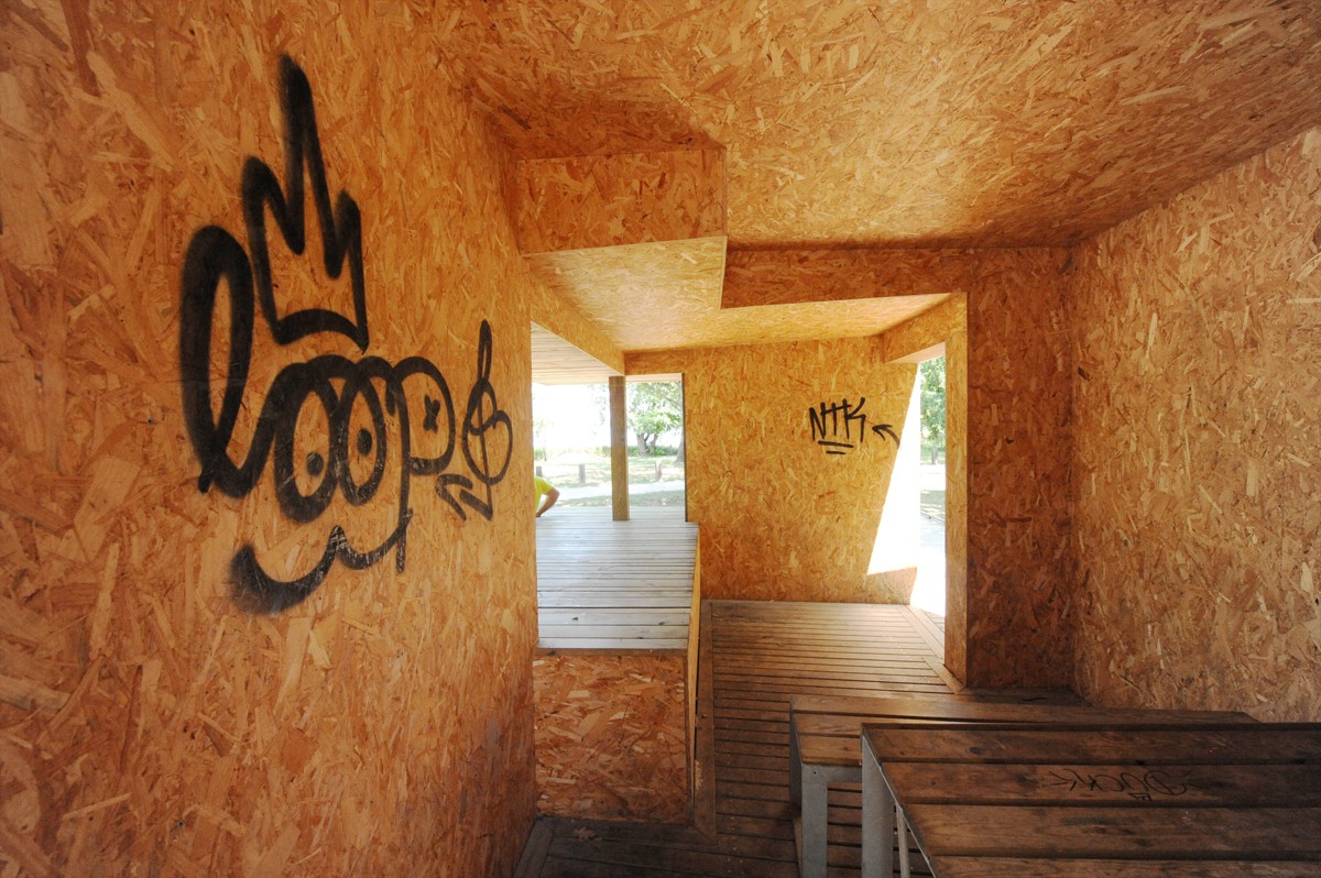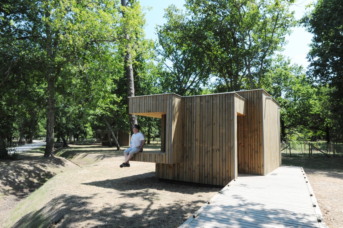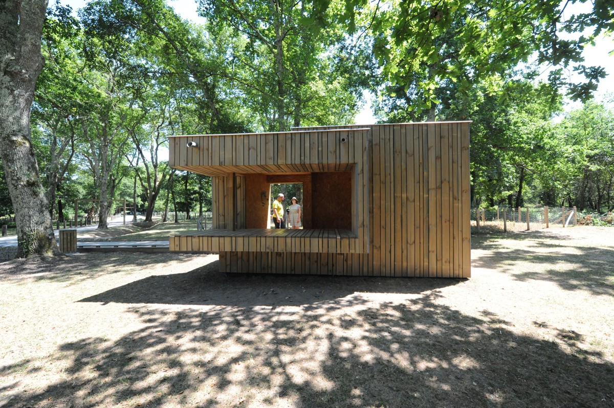 Pour ce projet il s’agissait, dans le cadre des travaux d’aménagements des abords de l’étang de Léon à Léon, de construire deux cabanes symétrique, ouvertes sur un point de vue sur le lac. Nous avons dessiné une cabane, et y avons ajouté sur l’angle, une fenêtre, en épaisseur, qui permet différents usages.