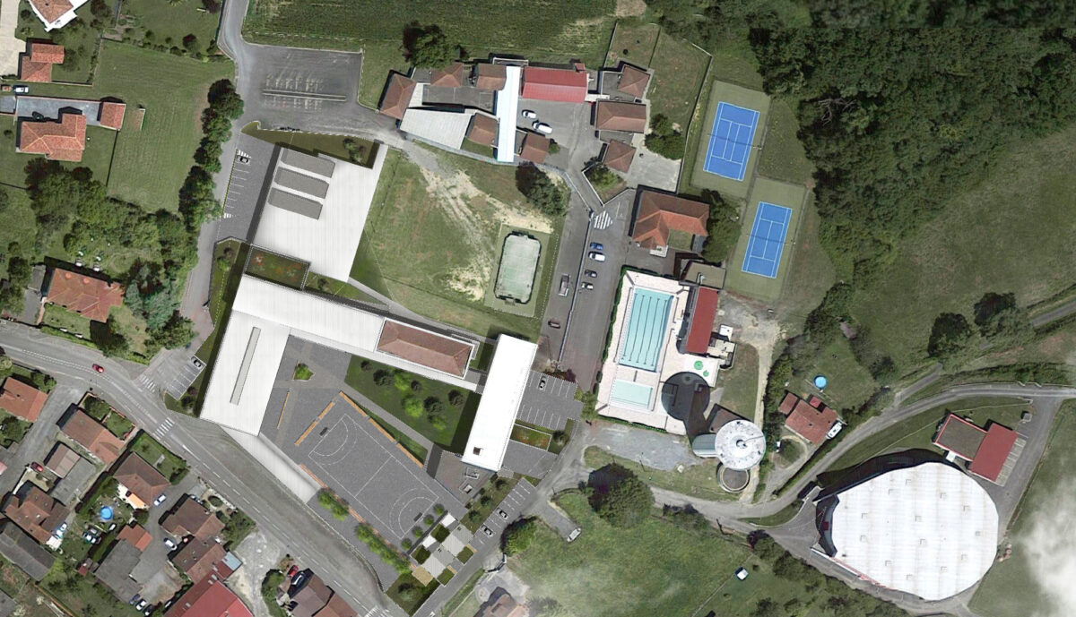 …. similaire par sa composition à celle constituant le cœur du village. Une succession d’espaces bâtis crée un front caractéristique des espaces urbains. Le travail de coursives abritées reprend le principe des arcades. Le nouveau collège se recompose autour de sa cour, à l’image du village d’Arzacq-Arraziguet, bâti autour de ses places — lieux de rencontre, de lien social et d’animation.