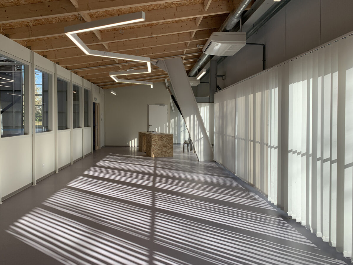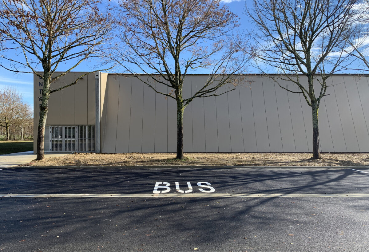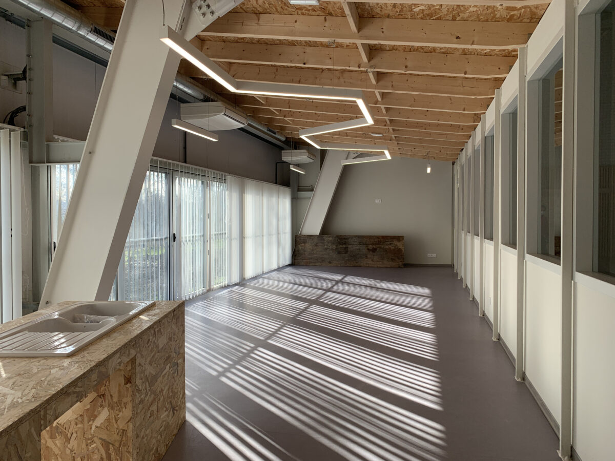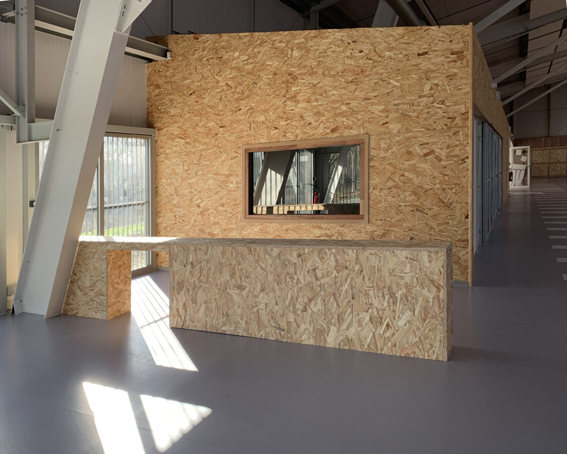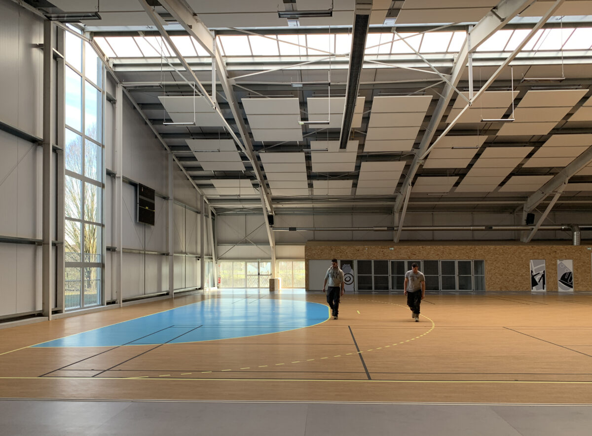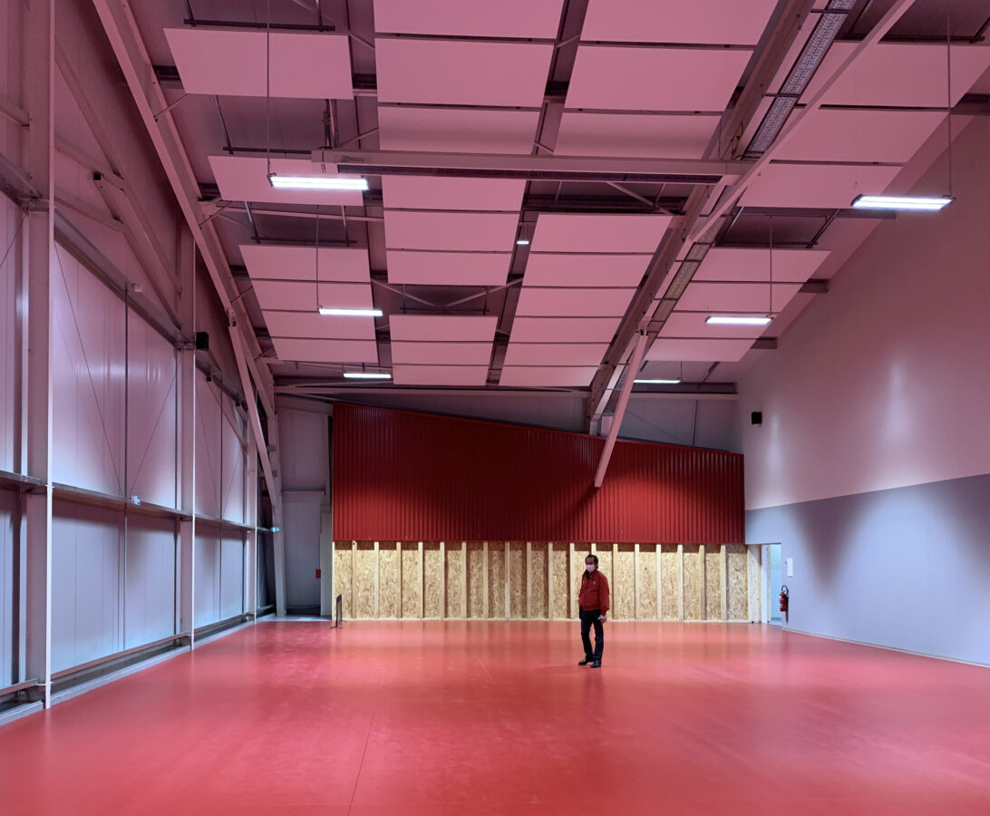 Il est réaménagé, isolé, chauffé et adapté aux pratiques du Handball et du Tennis de table. La couverture acier est déposée et remplacée par une toiture métallique isolée, la structure existante est renforcée pour supporter le poids d’une centrale solaire photovoltaïque. Les façades sont redressées et isolées thermiquement. Deux galeries périphériphériques sont construites dans le volume existant longeant les parois intérieures. La première dessert une tribune de 150 places. La seconde est constituées d’espaces dédiés aux associations (club house, bureaux, accueil) et de services (sanitaires et rangements). Une série d’ouvertures longitudinales est réalisée en facade ouvrant la vue des terrains de jeux sur le parc et la rivière du Gers. Une verrière zénithale, les panneaux acoustiques en sous-face de toiture et la mise en oeuvre d’une signalétique adaptée dessinent une succession d’éléments qui participent à la re-qualification d’un bâtiment purement fonctionnel.