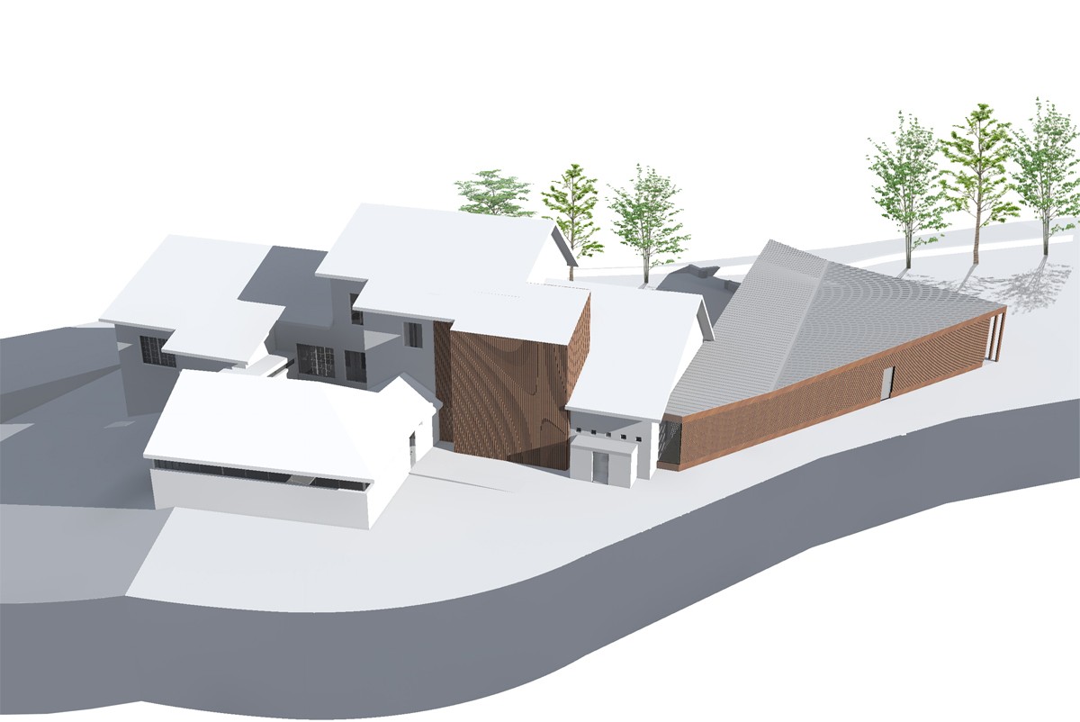 L’extension de l’école permet de créer en fond de place, un front bâti faisant face à l’église patrimoniale. Sa position en rotule des géométries existantes permet d’offrir une nouvelle façade sur la place tout en maintenant un dialogue entre les deux entités, et, en créant de la transparence à travers le nouveau bâtiment. Elle forme un socle avancé, d’où émergeront le volume des toitures existantes.