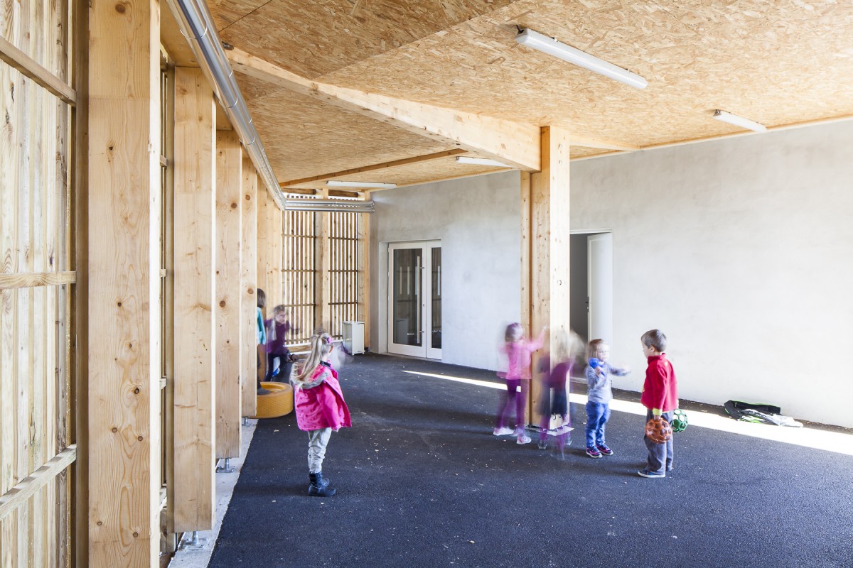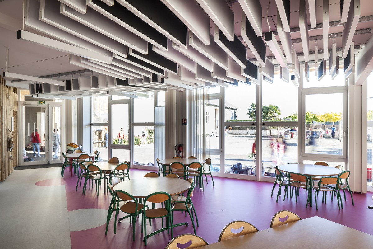 Un travail de remise à niveau de l’ensemble des espaces chauffés est réalisé afin de faciliter la circulation à l’intérieur du bâtiment tout en répondant aux normes d’accessibilité. Un nouveau préau est construit, porté en console, côté cour en continuité directe du bâtiment qui accueille la salle de restaurant, pouvant servir de salle polyvalente, sa cuisine, et des locaux de services. Ce préau est à la fois un espace extérieur abrité, et un cheminement entre la restauration et les salles de classe. Il crée une continuité visuelle entre l’extension et le bâtiment existant.
