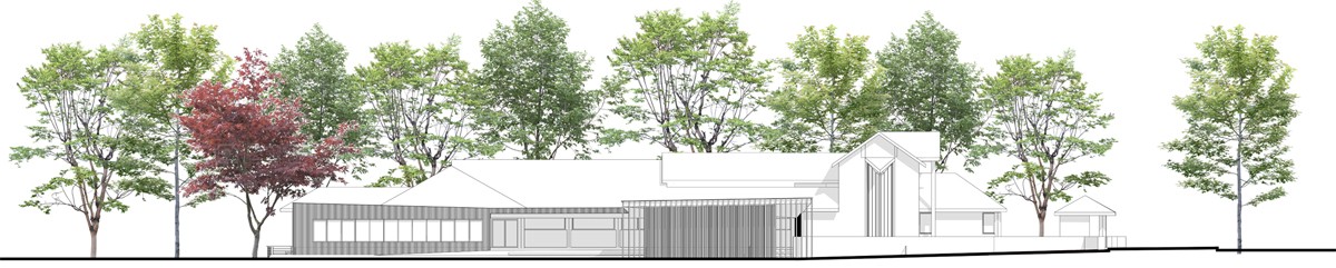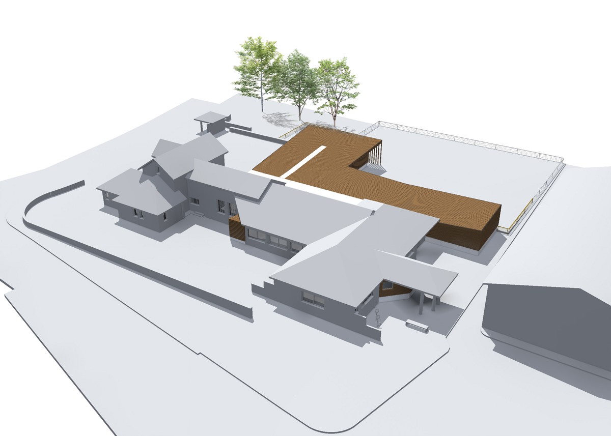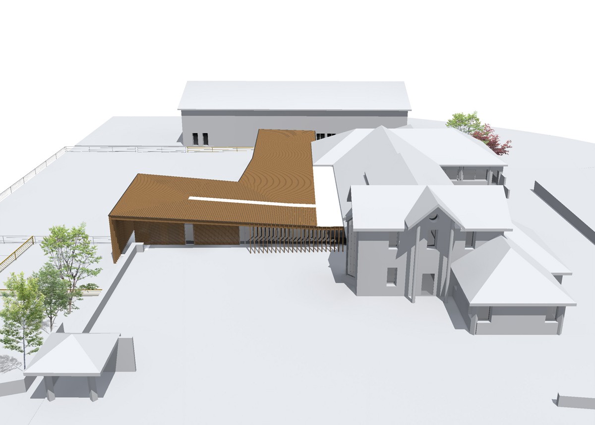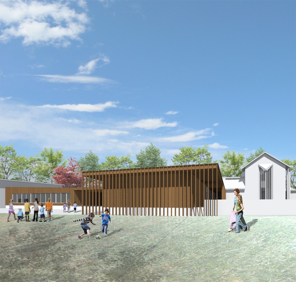 Les bâtiments à construire suivent le contour du bâtiment existant, et forme une avancée de plein pied vers le jardin public. La restauration/salle des mariages est directement accessible depuis la RD37, d’un côté, et la cour de l’école de l’autre. Une galerie extérieure permet de raccorder le bâtiment aux murets existants et forme un abri reliant le niveau parking et celui du jardin.