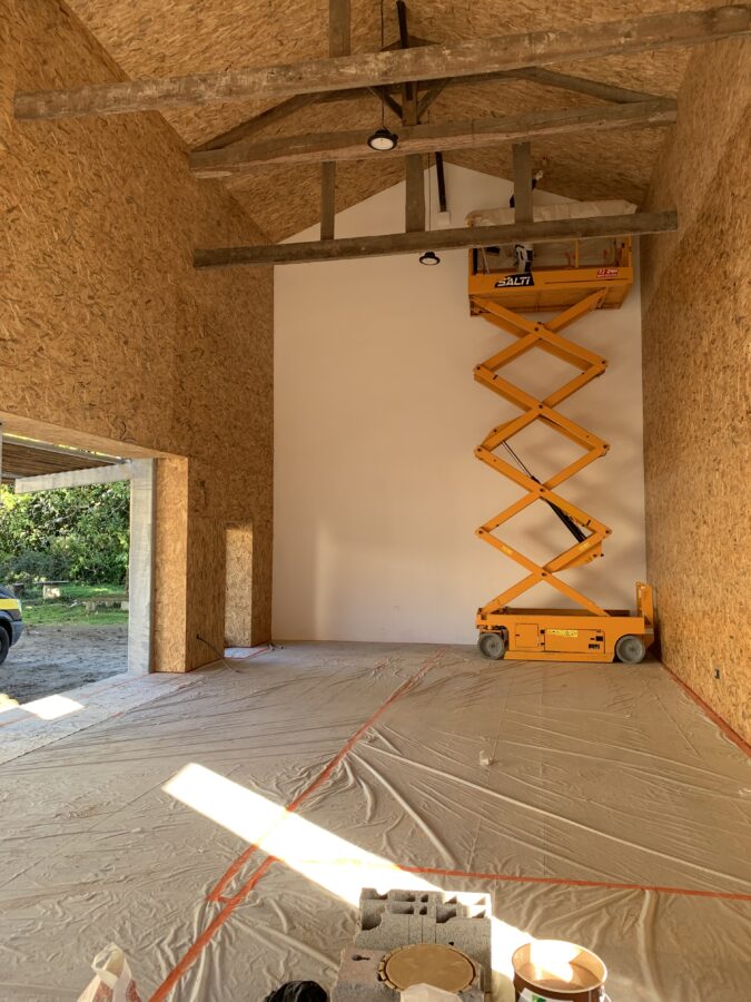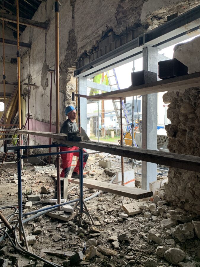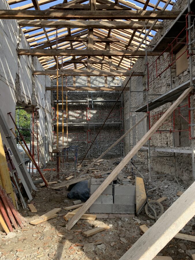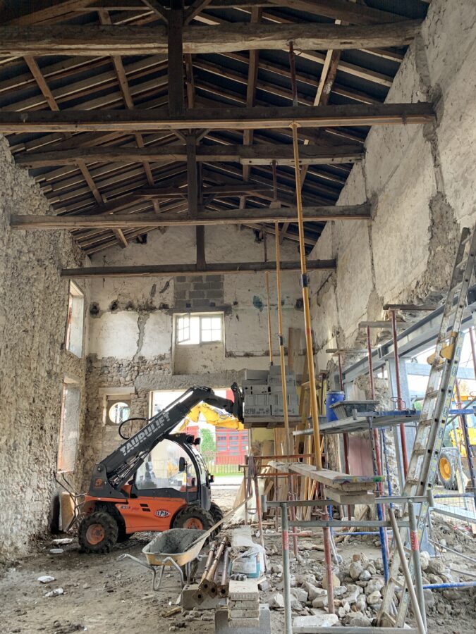 Le bâtiment de l’ancien cinéma est conservé, réhabilité et transformé en halle. Il s’agit d’un bâtiment du XVII eme siecle. La façade Ouest est largement ouverte afin de permettre l’accès et de créer une relation entre le bâtiment et l’extérieur. Un auvent en structure métallique, habillé de bois en sous-face et couvert de polycarbonate protège l’accès et couvre la déambulation le long du bâtiment. Les ouvertures existantes sont conservées et réhabilitées. Les menuiseries sont remplacées. L’ornement de la porte existante de la façade Ouest est déplacé sur cette même façade et vient habiller une nouvelle menuiserie fixe. L’intérieur du volume est habillé de panneaux de bois pour permettre les jeux de ball et le mur pignon est enduit. Le jardin entourant la halle est aménagé en plusieurs espaces dont un fronton.