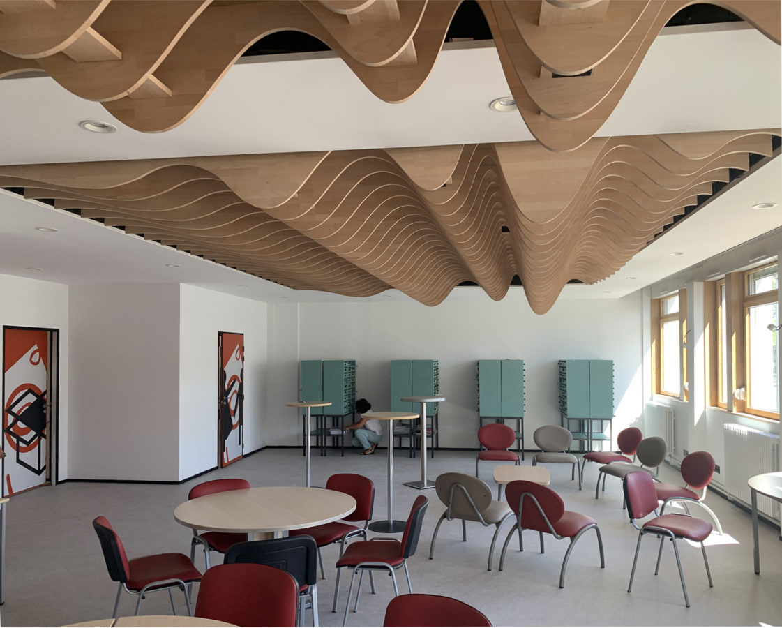 Dans les locaux de réception, un système de plafond en lames de hêtre contrecollé, découpées numériquement, permet de contextualiser le projet en développant un motif de drapé issu des peintures de Léon Bonnat, peintre bayonnais.