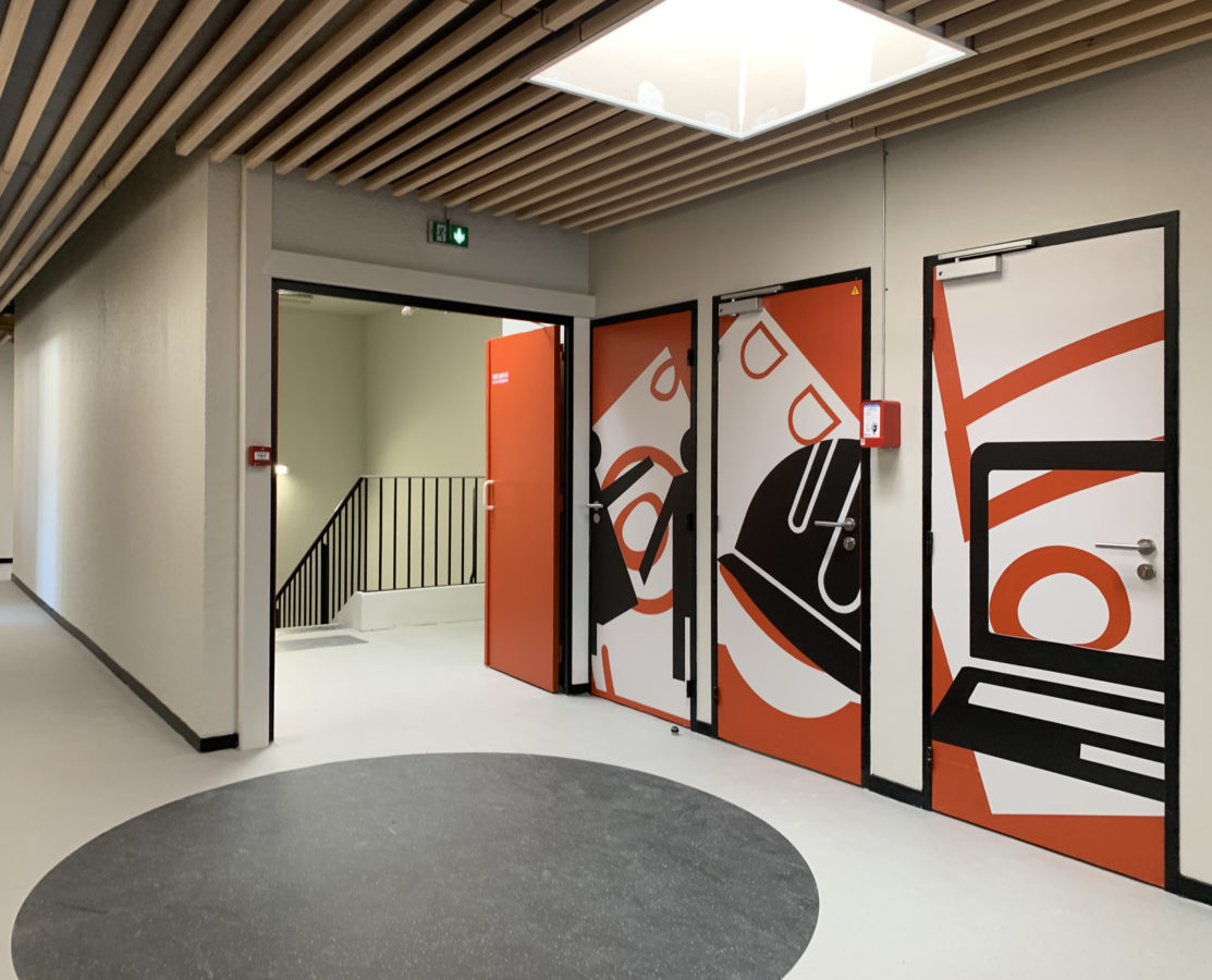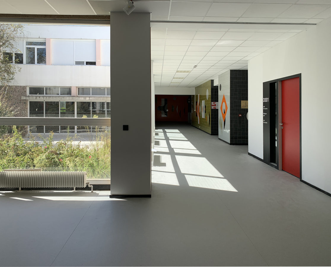 Les sols, quant à eux, sont recouverts de sols souples répondant à toutes les exigences de lieux de grand passage et d’entretien facilité. La déclinaison de figures et de teintes issues de la fresque 1% artistique du lycée sert de point de départ au système de signalétique mis en oeuvre. Le panel de couleurs défile d’un bâtiment à l’autre, s’applique en sol en déclinaison de formes géométriques, sur les murs pour les numéros d’étage, et sur les portes. Des kakémonos sont associés à chaque porte élargissant leur figures, pour indiquer le nom et le numéro de la salle.