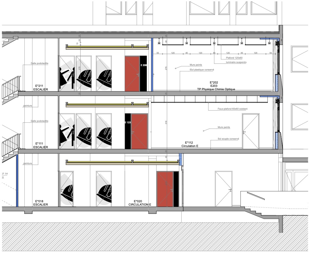 L’objectif est de retrouver une esthétique d’ensemble en s’appuyant sur une forme de continuité séquencée, aidant au repérage et au confort des usagers. En rénovant ces espaces, nous améliorons la lisibilité des parcours en travaillant sur la distinction des espaces les uns par rapport aux autres, la transition entre ceux-ci, leur apport en lumière naturelle et leur rapport à l’extérieur…………