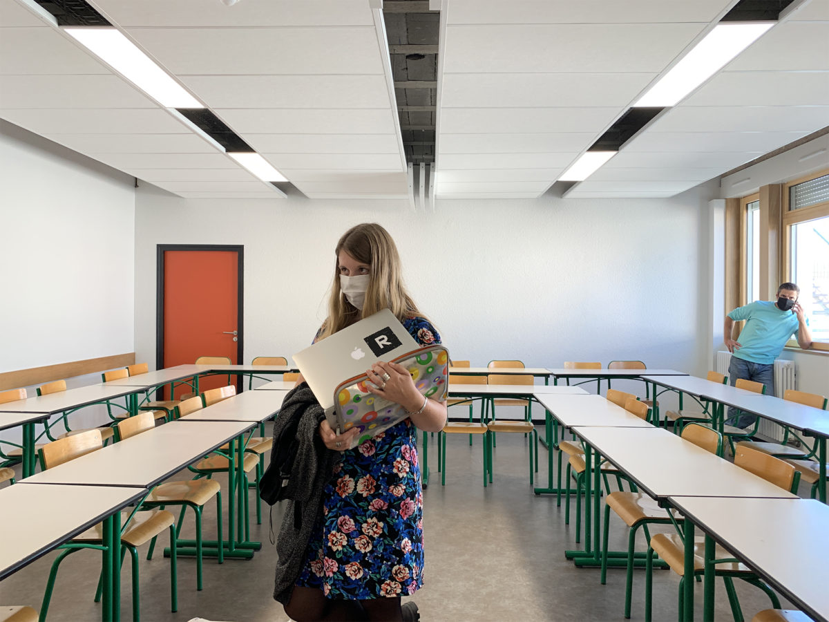 Les salles de classe sont globalement traitées avec une sobriété de matériaux et de couleurs. Les murs sont peints en blanc. Les sols sont des revêtements plastique en déclinaisons de gris, en continuité de ceux des circulations. Les plafonds intègrent les panneaux acoustiques indispensables au confort des usagers, délimitant des zones particulières d’éléments en suspension.