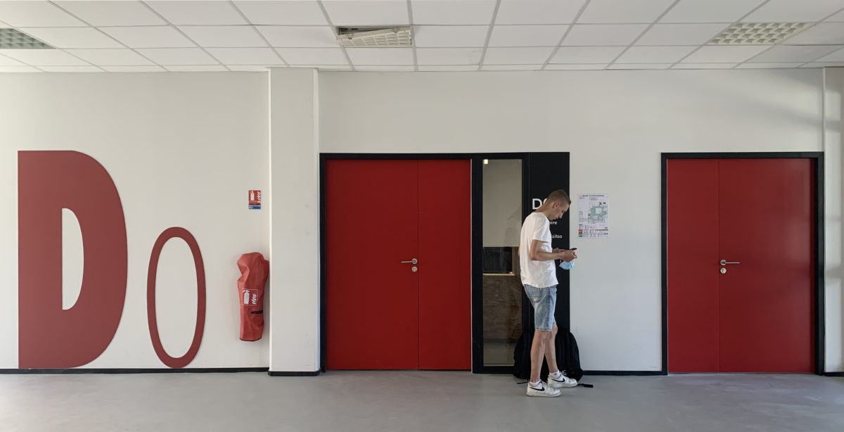 Les couloirs de distribution et les espaces de dilatation aux RDC ou à hauteur des paliers aux étages sont les premiers espaces pratiqués et de fait deviennent les supports principaux de la signalétique. Pour “éclairer” les longs couloirs sombres, le choix du blanc s’impose pour les murs. Habillés de lames de bois horizontales, verticales ou inclinées, jusqu’à hauteur des portes, les murs sont protégés des impacts et des chocs. Les lames posées en claire-voie intègrent des éléments de signalétique.