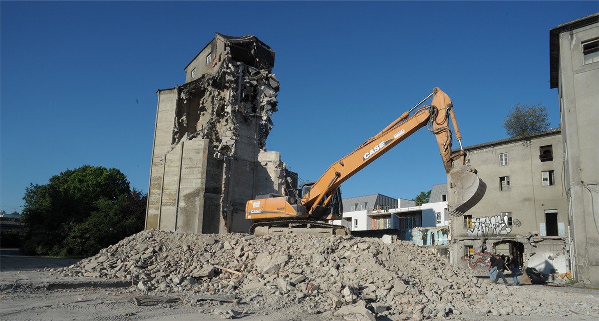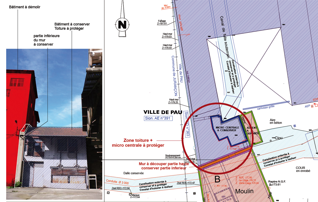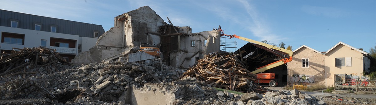 La démolition et la dépollution de la minoterie ont nécessité un phasage très précis des travaux afin d’utiliser les gravats d’un premier bâtiment pour l’édification d’une butte permettant d’atteindre les ouvrages les plus hauts. La complexité des travaux vient tout d’abord de la constitution des ouvrages à déconstruire: une rehausse en béton armé avait éte posée en 1958 sur une structure maçonnée du 19ème siecle. La rigidité de cet ouvrage a nécessité une patiente intervention manuelle. La seconde difficulté est due à la proximité et à la mitoyenneté de bâtiments contigus au chantier. Pour cette phase, nous avons découpé soigneusement les ouvrages, en utilisant le contreventement de l’édifice pour stabiliser le chantier. La principale dificulté vient de la présence sous l’édifice à déconstruire du canal d’amenée d’eau d’une centrale hydro-électrique en fonctionnement. Un radier protecteur du canal a donc eté construit préalablement au commencement des travaux.