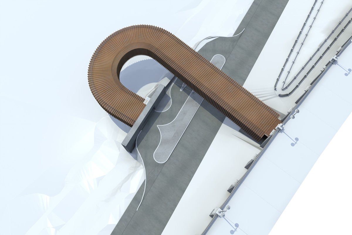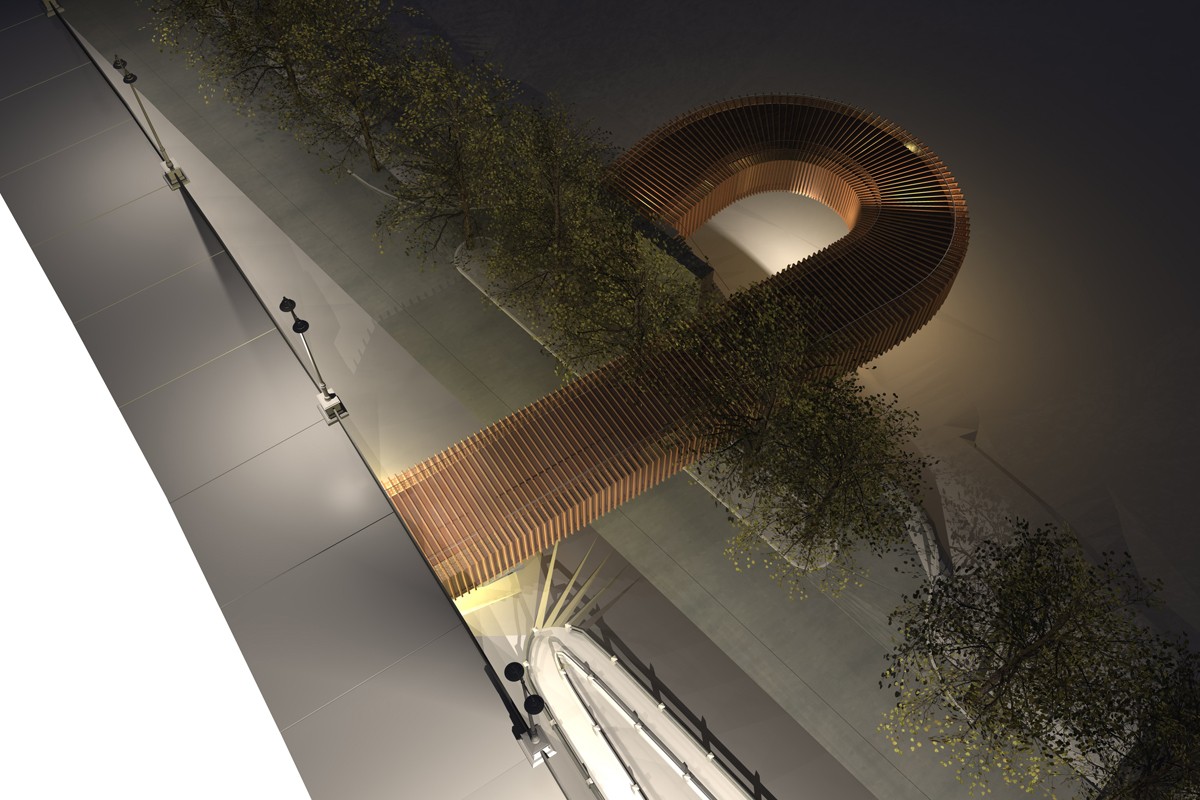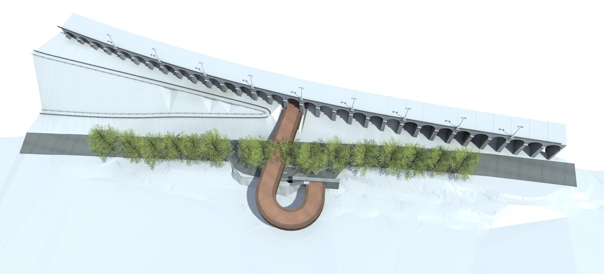 Il s’agit ici de construire un acces au Parking Aragon, situé sous le Boulevard des Pyrénées, élément patrimonial majeur de la ville de Pau. Cette véritable «ponction urbaine» a pour objectif d’évacuer, en partie, la circulation automobile du centre-ville. L’entre-deux du flanc du coteau devient un espace de rencontres, futur carrefour d’agitation urbaine, qui ponctue, par sa présence dominante, ce territoire en mutation.