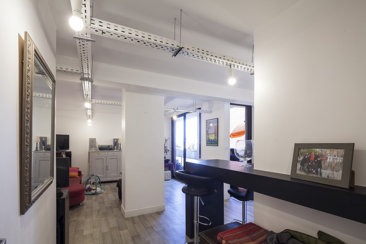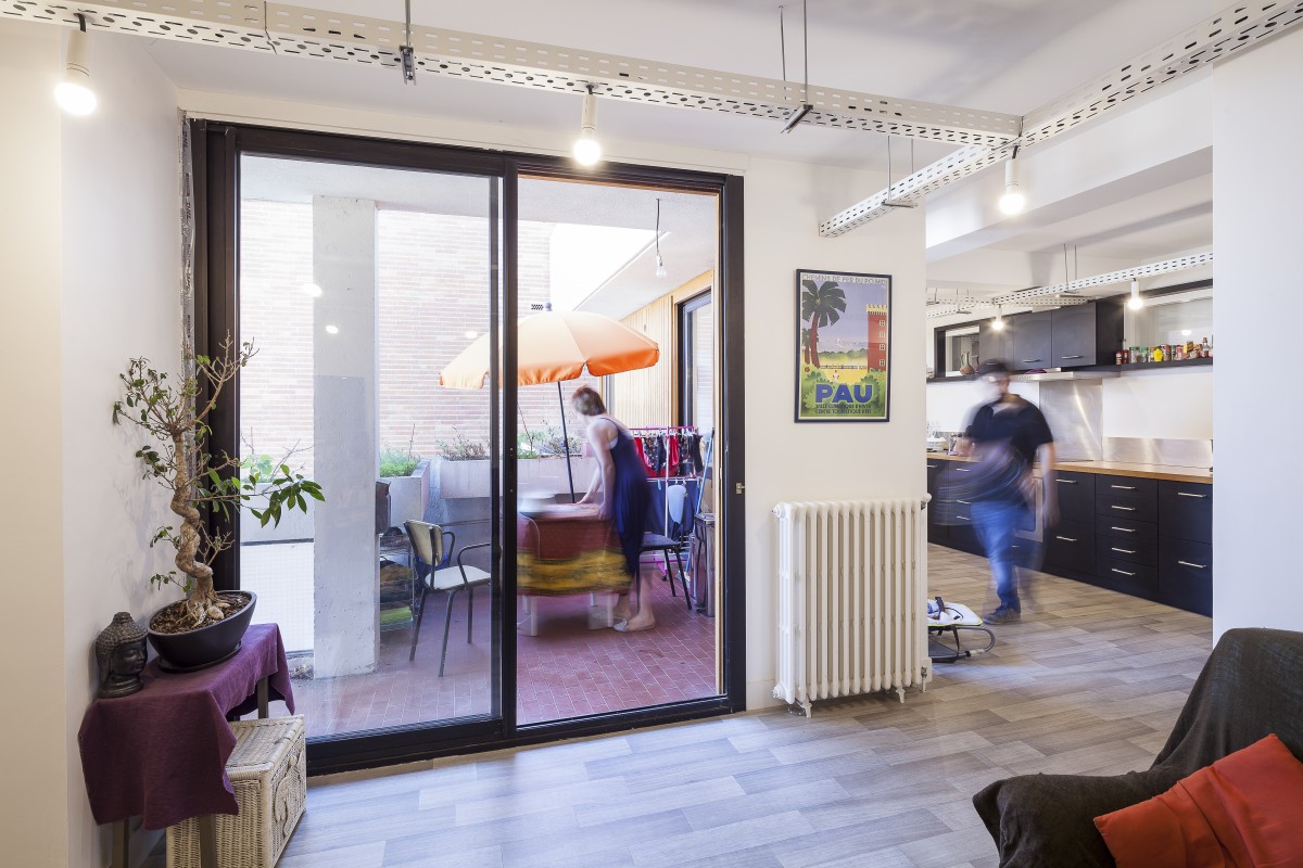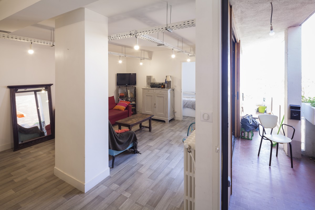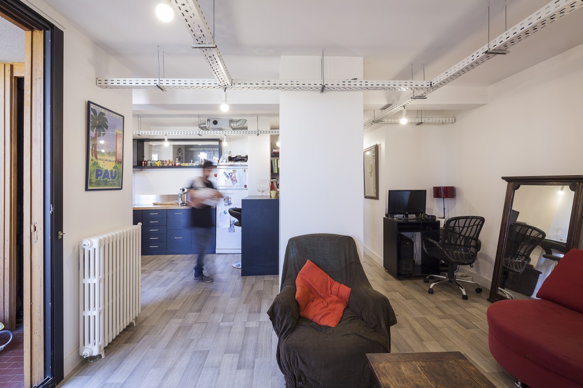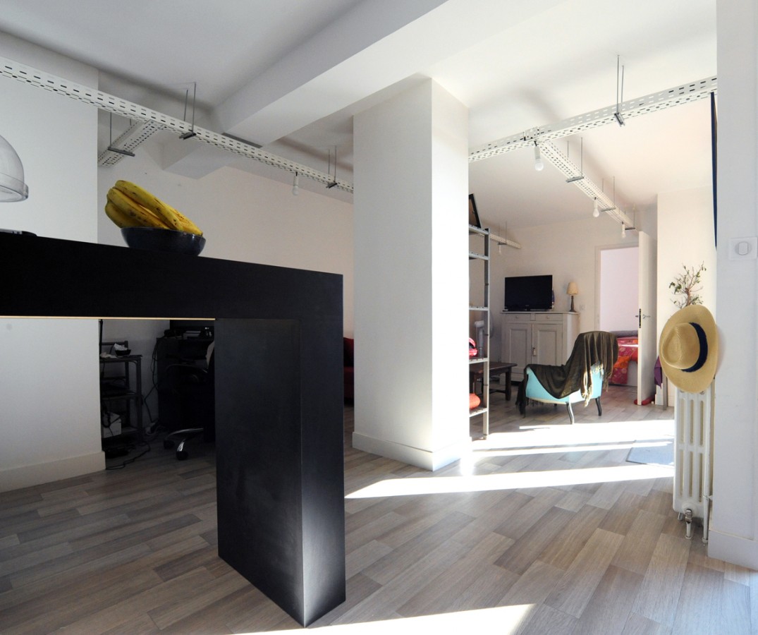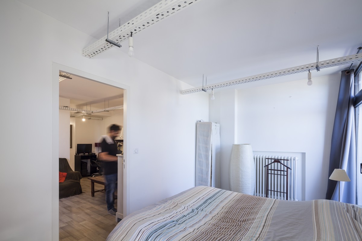 Dans un immeuble réalisé en 1967 par Fabien Castaing, il a suffit d’ouvrir les cloisons, et de récupérer la surface des couloirs pour installer les pièces humides. Les éléments de structures traversent les plafonds. Un chemin de câble se glisse en dessous et supporte de simples ampoules qui constituent les luminaires. Trois meubles, et deux vitrages intérieurs, complètent le dispositif, qui relie les pièces.