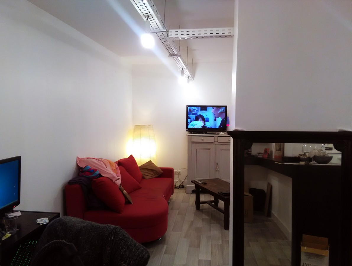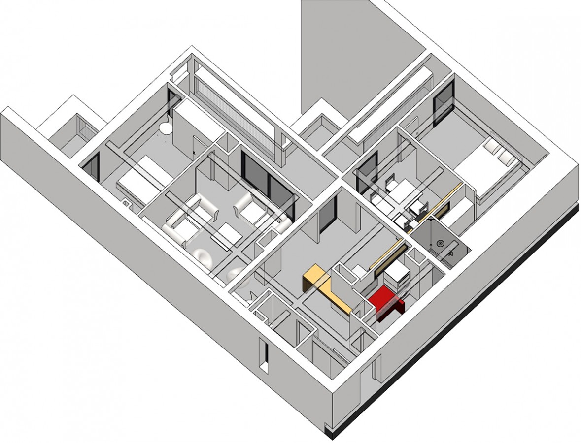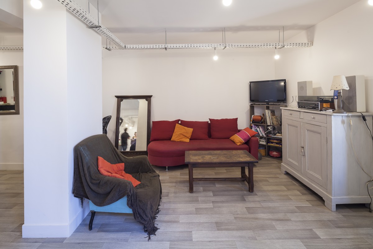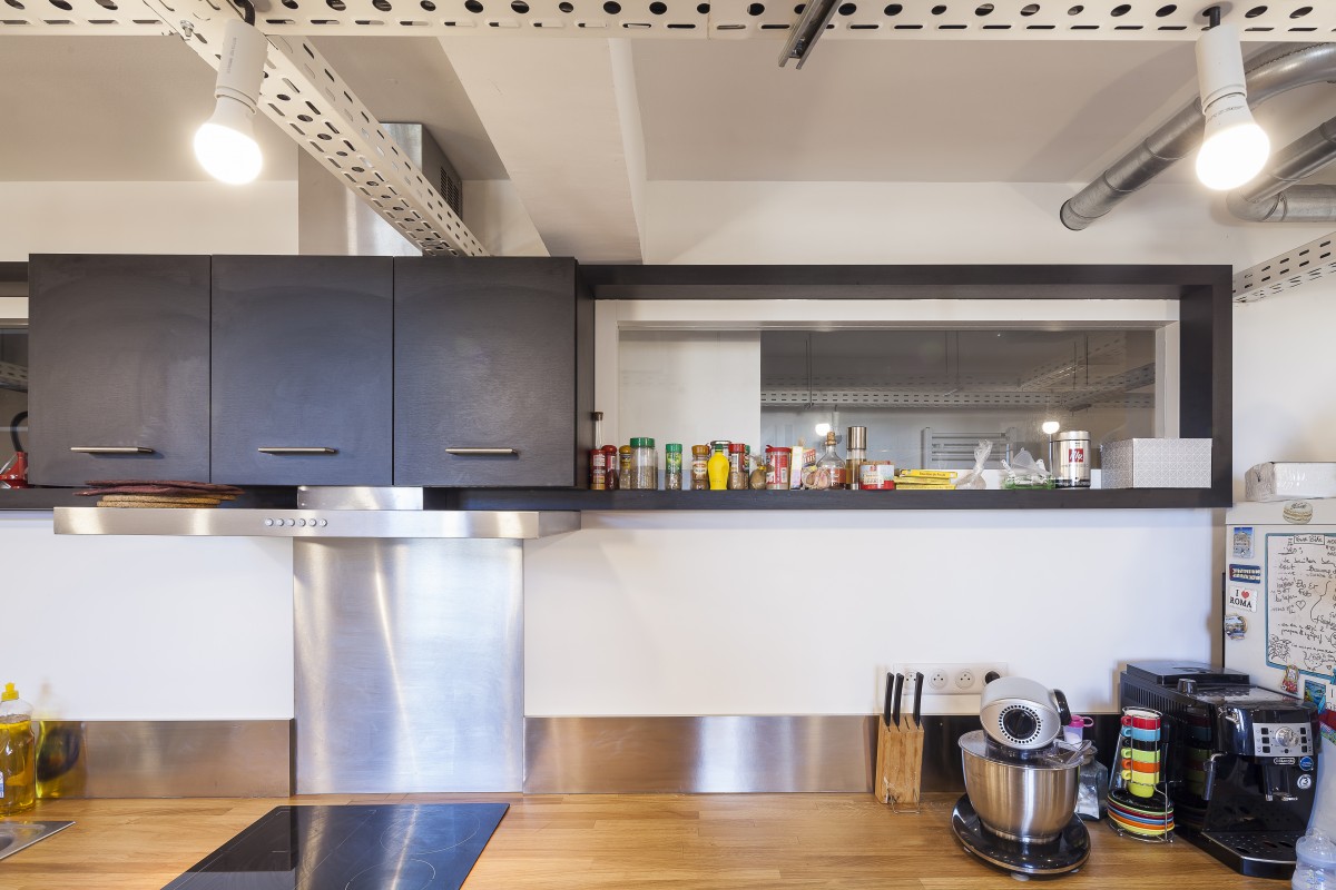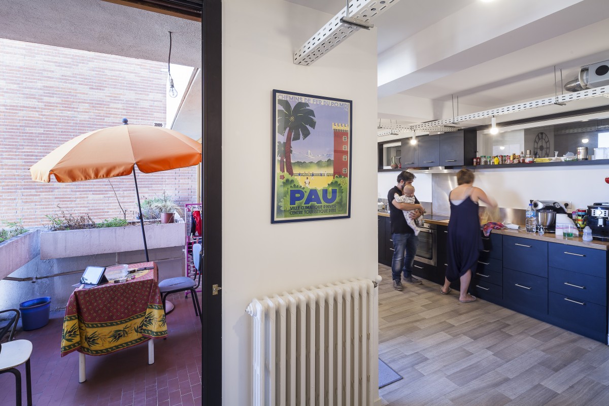 Dans un immeuble réalisé en 1967 par Fabien Castaing, il a suffit d’ouvrir les cloisons, et de récupérer la surface des couloirs pour installer les pièces humides. Les éléments de structures traversent les plafonds. Un chemin de câble se glisse en dessous et supporte de simples ampoules qui constituent les luminaires. Trois meubles, et deux vitrages intérieurs, complètent le dispositif, qui relie les pièces.