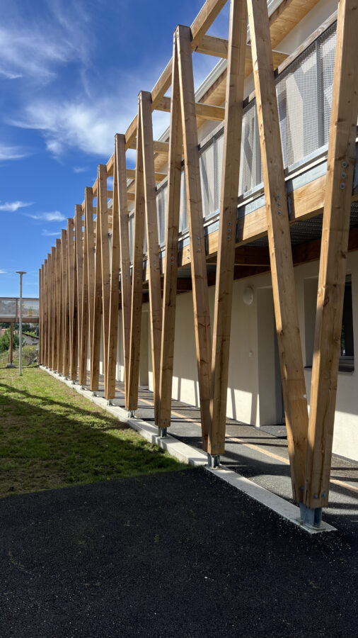 …. en limite Ouest de la parcelle, et créent un espace accueillant au Sud, longé de coursives couvertes de pergola réunissant l’ensemble.