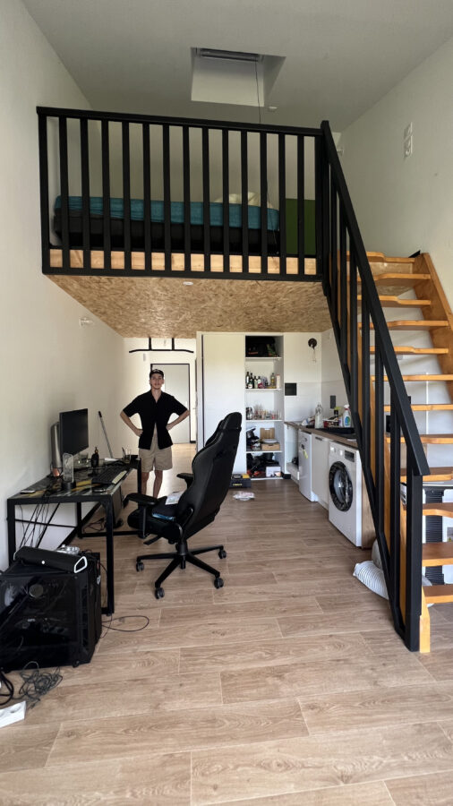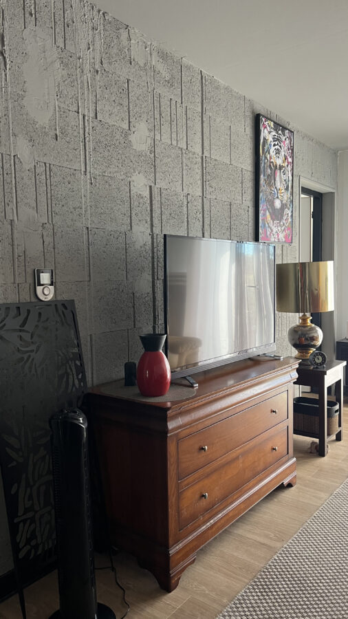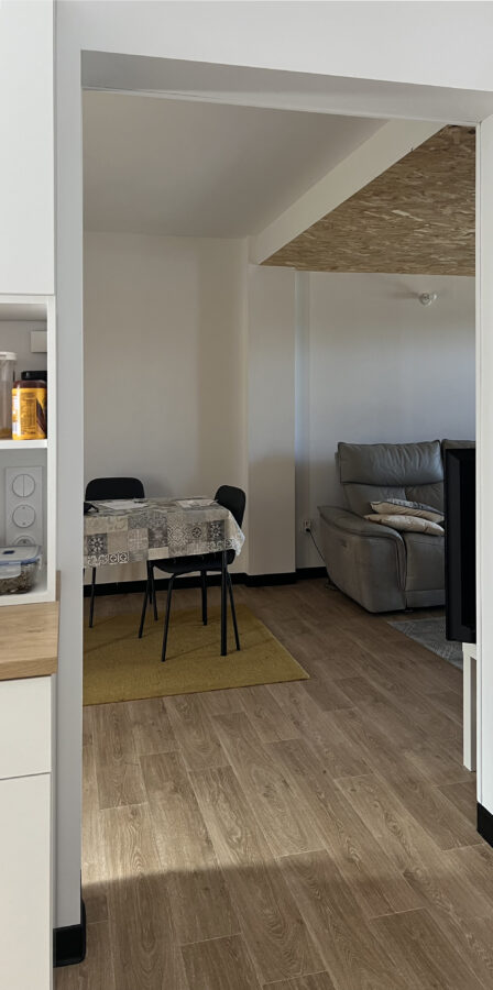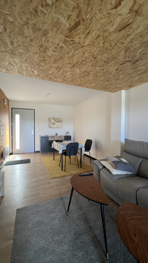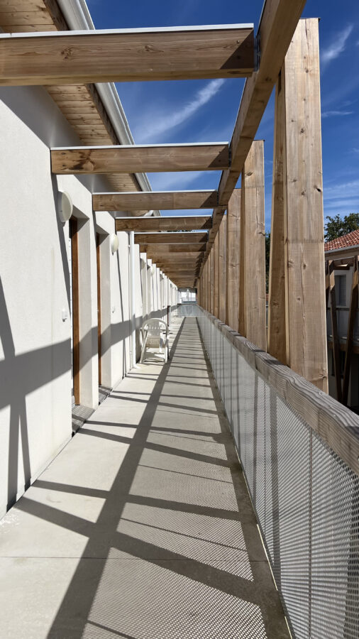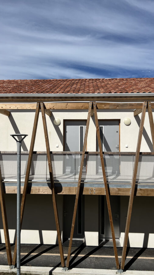 …. en limite Ouest de la parcelle et créent un espace accueillant au Sud, le long des coursives couvertes de pergola qui les réunissent. La fragmentation du projet en plusieurs volumes, en implantés suivant des directions variables, permet de donner au projet une échelle humaine cohérente avec l’environnement résidentiel alentour. Les logements traversants utilisent le volume du comble pour aménager un espace en mezzanine, cabane perchée, qui prolonge l’espace à vivre. L’utilisation des parpaings de béton peints sans enduit, et des panneaux de contreventement de la structure en ossature bois, met en avant la pertinence du système constructif, créé des contrastes intéressants dans les espaces intérieurs, et constitue une solution durable et résistante qui participe de la démarche éco-responsable qui réduit l’utilisation de matériaux supplémentaires, en utilisant les ressources locales et faciles à produire comme le parpaing et les panneaux de bois.