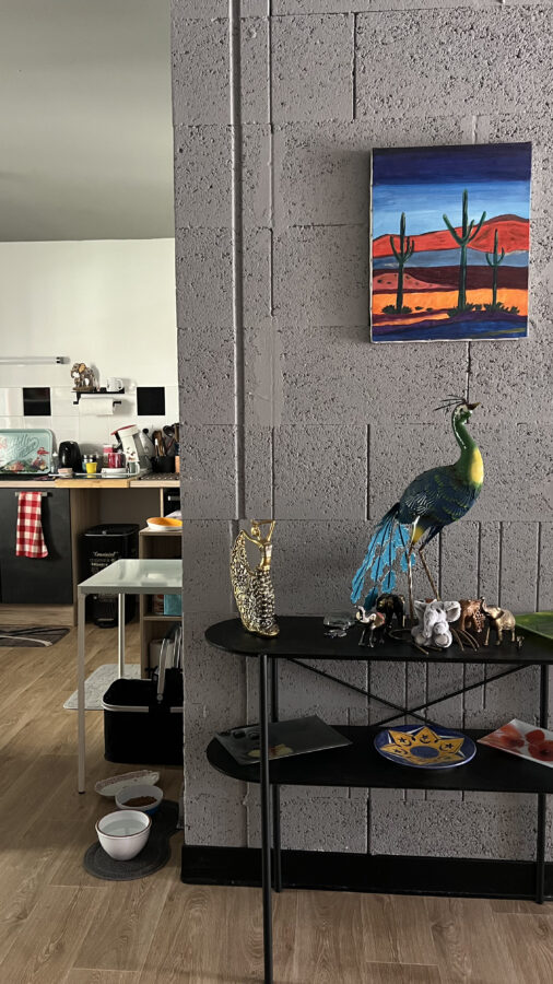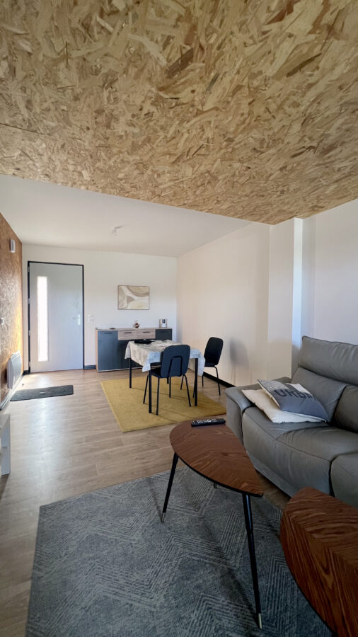 L’utilisation de parpaings béton peints sans enduit et les panneaux de contreventement de la structure bois apparents, mettent en avant la pertinence d’un système constructif et créent des contrastes intéressants dans les espaces intérieurs. Cette solution durable et résistante participe de la démarche éco-responsable qui réduit l’utilisation de matériaux supplémentaires, en utilisant les ressources locales et traditionnelles comme la maçonnerie de blocs et l’ossature bois.