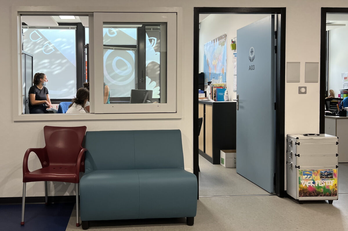 …. un univers géométrique proposant des visuels variés. Chaque visuel associe une figure signifiante, et un fond graphique. La figure est un signe adapté. Le fond prolonge l’image de la figure, agissant comme une ombre. Il participe à la profondeur de l’image en équilibrant sa composition. Ces logos sont mis en place sur les portes, nous assurant ainsi de la meilleure compréhension tout en contrôlant l’impact visuel en le concentrant sur une seule surface. Lorsque les portes sont pleines, les logos associent le blanc, le noir et le gris. Lorsque les portes sont vitrées, nous jouons sur le transparent et le translucide toujours en suivant la même déclinaison de motifs. Nous intégrons ainsi dans la charte graphique de la signalétique, la mise en oeuvre d’éléments visuels contrastés par rapport à l’environnement immédiat permettant de repérer les parois vitrées. Cette déclinaison de logos sous forme de grands adhésifs à la localisation très définie permet une très grande évolutivité du système puisque chaque visuel peut facilement être remplacé, par un visuel déjà existant ou une nouvelle déclinaison inédite. La signalétique s’intègre subtilement à l’architecture sans la concurrencer ni la surcharger. Elle présente une identité forte et très lisible, se plaçant au service du projet et des usagers.